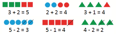 Было 3 зелёных квадрата и 2 красных. Сколько всего квадратов? Как это записать?