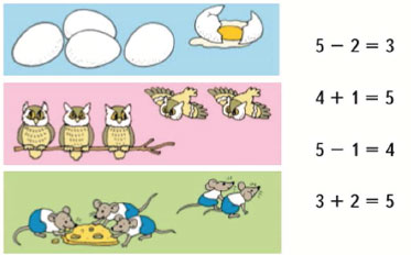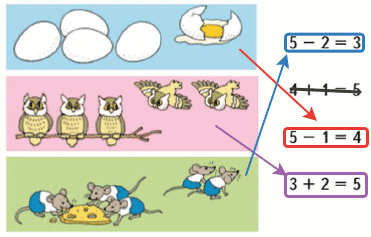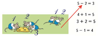 Было 5 мышат. 2 мышонка убежали. Стало 3 мышки.