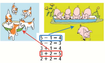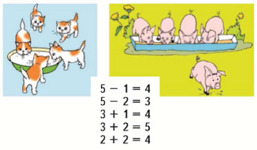 Было 5 поросят. 1 поросёнок убежал. Осталось 4 поросёнка.