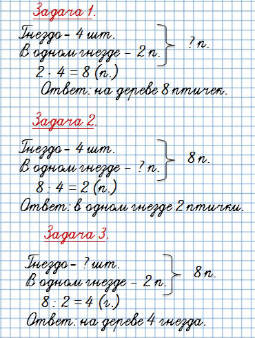 8 птичек поселились в гнездах на дереве. В каждом гнездышке было по 2 птички. Сколько всего гнёзд на дереве?