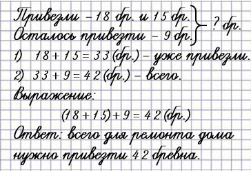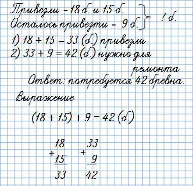 5. Для ремонта дома сначала привезли 18 брёвен, а потом ещё 15. Осталось привезти 9 брёвен. Поставь вопрос и реши задачу.