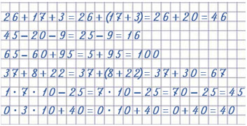 | 26 + 17 + 3 = 26 + (17 + 3) = 26 + 20 = 46 | 65 - 60 + 95 = 5 + 95 = 95 + 5 = 100 |