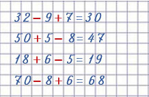 | 32 - 9 + 7 = 30 | 18 + 6 - 5 = 19 |