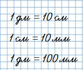 | 56 мм = 5 см 6 мм | 67 дм > 6 м 5 дм |