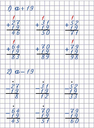 | 27 + 19 = 46 31 + 19 = 50 52 + 19 = 71 64 + 19 = 83 70 + 19 = 89 79 + 19 = 98 | 27 - 19 = 8 31 - 19 = 12 52 - 19 = 33 64 - 19 = 45 70 - 19 = 51 79 - 19 = 60 |