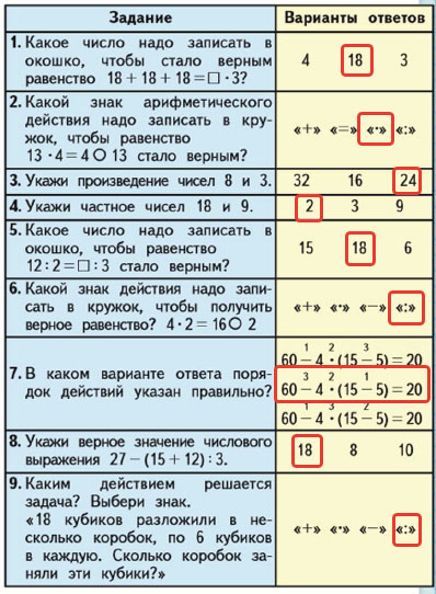 | 8. Укажи верное значение числового выражения 27 - (15 + 12) : 3. | 18 8 10 |