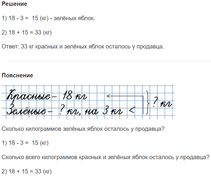 5. У продавца осталось 18 кг красных яблок, а зелёных — на 3 кг меньше. Сколько всего килограммов красных и зелёных яблок осталось у продавца?
