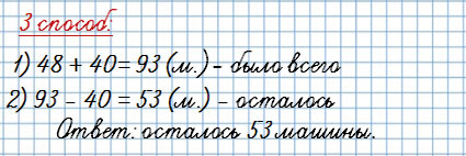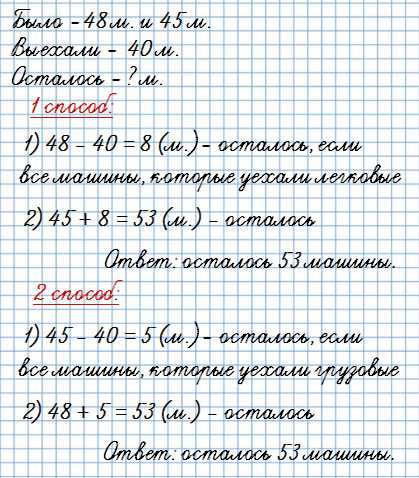 4. В гараже стояло 48 легковых машин и 45 грузовых. Сколько машин осталось в гараже, когда выехало 40 машин?