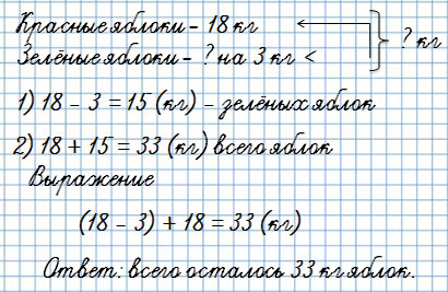 5. У продавца осталось 18 кг красных яблок, а зелёных - на 3 кг меньше. Сколько всего килограммов красных и зелёных яблок осталось у продавца?
