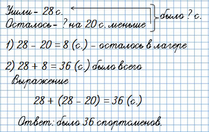7. Из спортивного лагеря ушли в поход 28 спортсменов, а осталось в лагере на 20 человек меньше. Сколько всего спортсменов было в лагере?