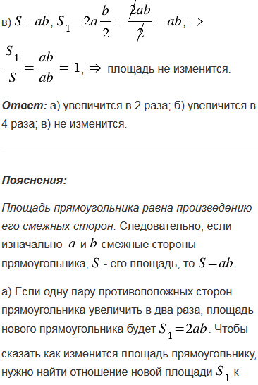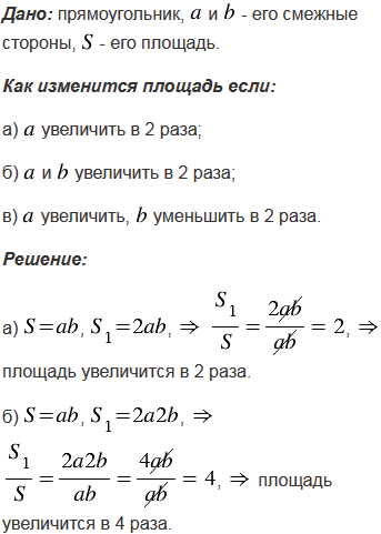 Как изменится площадь прямоугольника, если: а) одну пару противоположных сторон увеличить в два раза; б) каждую сторону увеличить в два раза; одну пару противоположных сторон увеличить в два раза, а другую - уменьшить в два раза?