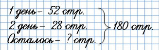 8. В книге 180 страниц. В первый день ученик прочитал 52 страницы, во второй - 28 страниц. Сколько страниц ему осталось прочитать? Реши задачу разными способами.