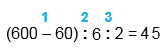 1) 600 - 60 = 540 2) 540 : 6 = 90 3) 90 : 2 = 45