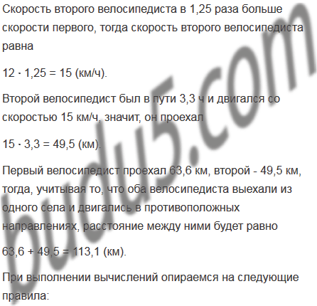 Велосипедист выехал из села со скоростью 12 км/ч. Через 2 ч в противоположном направлении из того же села выехал другой велосипедист, причем скорость второго в 1,25 раза больше скорости первого. Какое расстояние будет между ними через 3,3 ч после выезда второго велосипедиста?