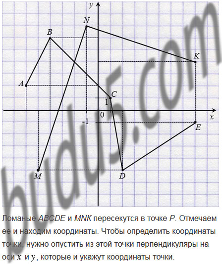 1; 7), К(8; 4). Найдите координаты точек пересечения ломаных АВСDЕ и МNК.