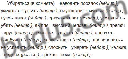 Убираться (в комнате), умаяться, смуглявый, пузо, брюхо, укокошить, дылда, трепач, ухмылка, оплеуха, зенки, проворонить, сдохнуть, жадюга, брехня.
