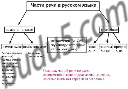 • Какие слова не входят в систему частей речи? Как это отображено на схеме?