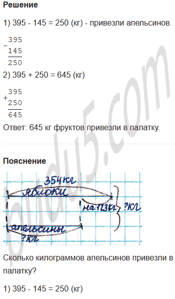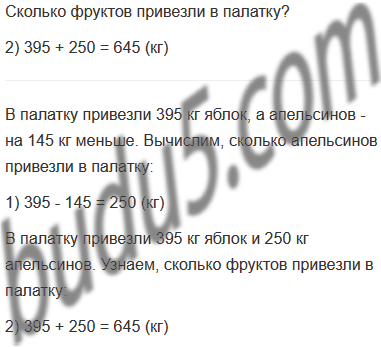 Задание № 6. В палатку привезли яблоки и апельсины. Яблок было 395 кг, а апельсинов - на 145 кг меньше. Сколько фруктов привезли в палатку?