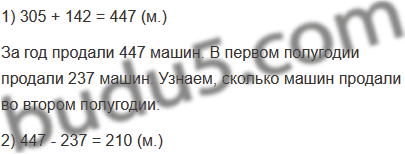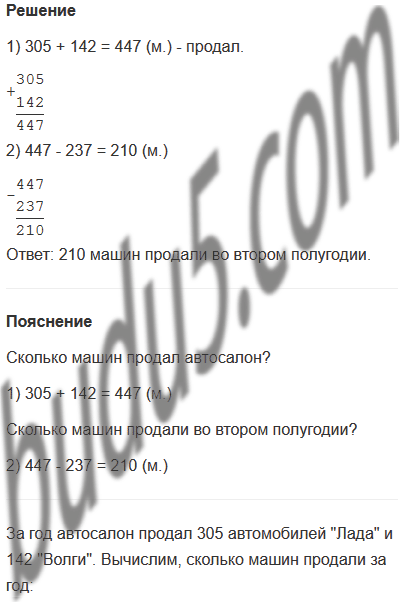 Задание № 7. За год автосалон продал 305 автомобилей "Лада" и 142 "Волги". В первом полугодии продали 237 машин. Сколько машин продали во втором полугодии?