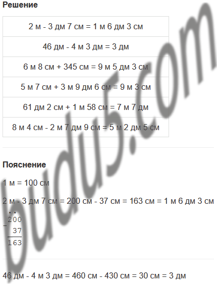 | 2 м - 3 дм 7 см | 5 м 7 см + 3 м 9 дм 6 см |