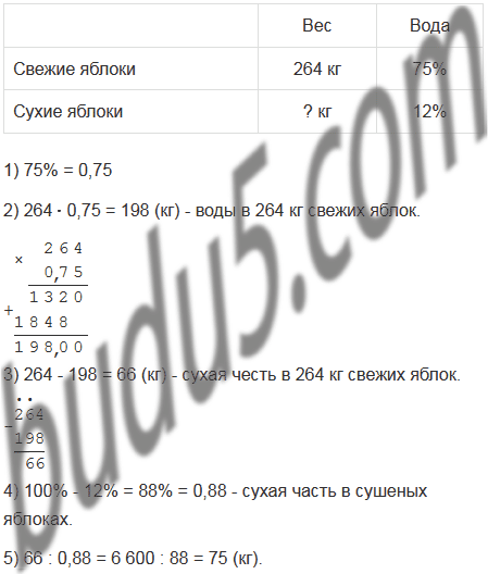 Свежие яблоки содержат 75% воды, а сушеные - 12%. Сколько килограммов сушеных яблок получится из 264 кг свежих?