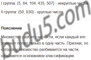 Задание № 4. Разбей на части множество чисел А = {5, 50, 84, 104, 435, 507, 930}. Найди несколько решений. Для каждого решения укажи основание классификации, полученные группы и их название.