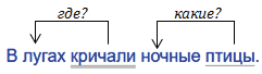 В лугах кричали ночные птицы. на вопрос кто? отвечает слово птицы, оно является подлежащим и подчеркивается одной чертой. На вопрос что делали? отвечает слово кричали, оно является сказуемым и подчеркивается двумя чертами. Главные члены предложения - птицы кричали. От сказуемого можно задать вопрос где? к сочетанию в лугах. в лугах - второстепенный член предложения. От подлежащего птицы можно задать вопрос какие? к слову ночные, ночные - второстепенный член предложения. В предложении два словосочетания - кричали в лугах, ночные птицы.