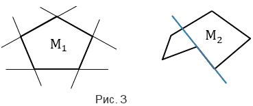 Выпуклый многоугольник - это многоугольник, который лежит по одну сторону от каждой прямой, проходящей через две его соседние вершины. На рис.3 многоугольник М1 является выпуклым многоугольником, а многоугольник М2 - невыпуклым.